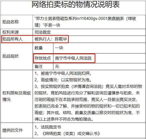 记者查阅拍卖公告发现,这些手表都来自同一个被执行人,陈载华。
