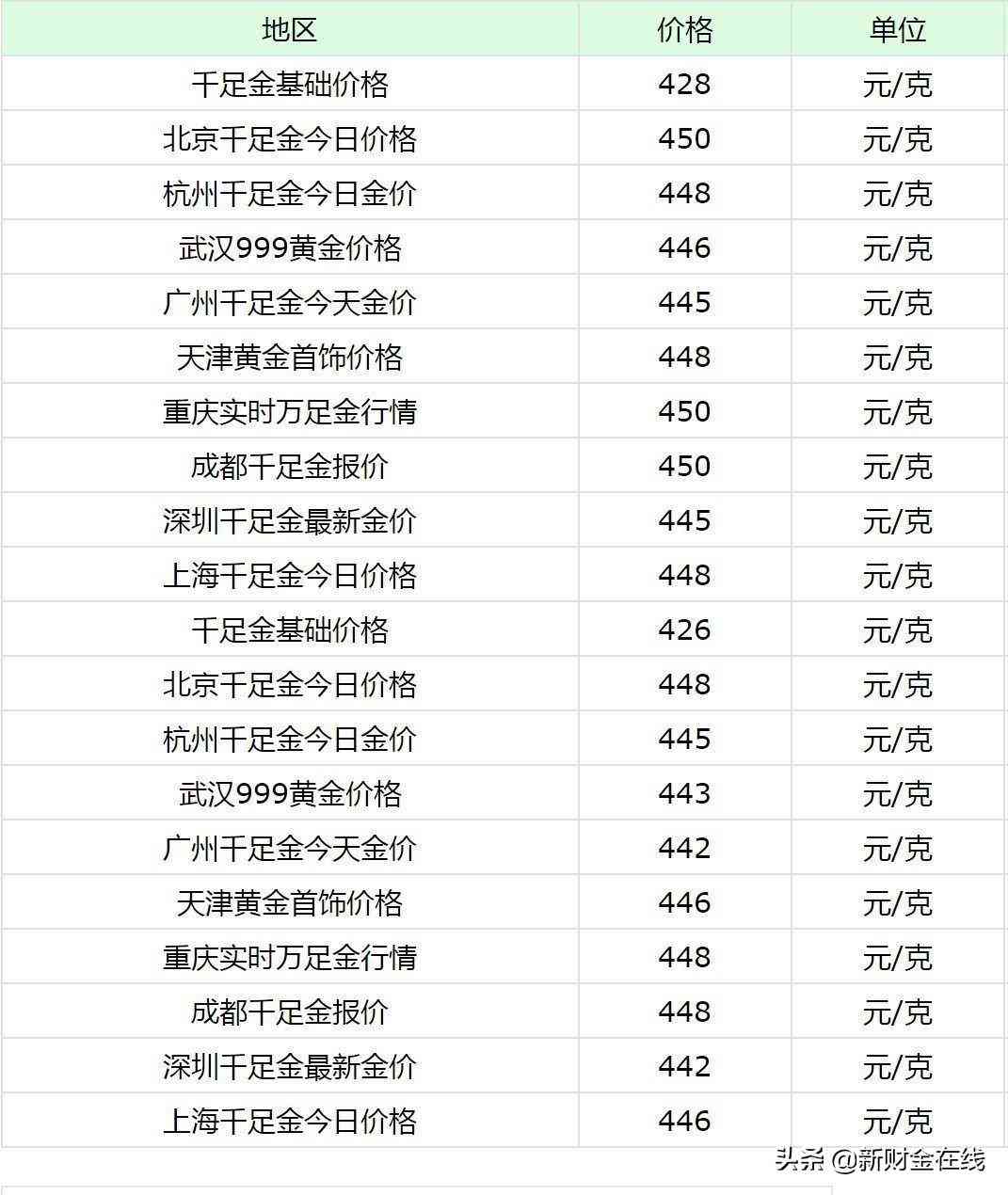 以下为各地黄金原料的参考价格。通常,各金店的黄金首饰价格与黄金原料价(9999万足金、999千足金)相比,会有不同的费用加价,主要是工艺、品牌等因素,基本上为50-100元/克的加工及品牌费。以下价格仅供参考,具体以实际为主。