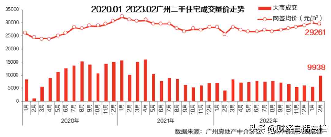广州市二手住宅成交量(自助网签+中介网签)为9938宗;环比2023年1月同期(6025宗)环比大涨78.7%,同比去年2月上涨1.4倍。