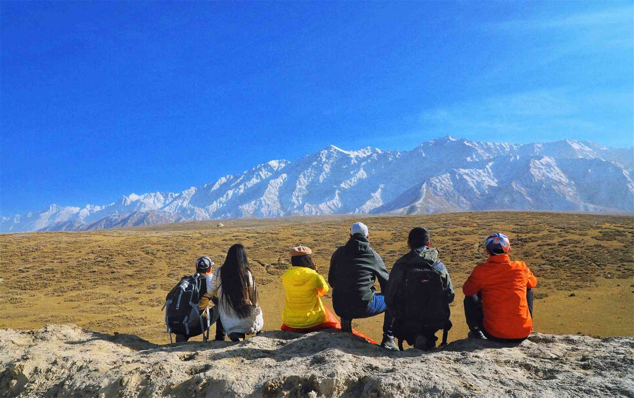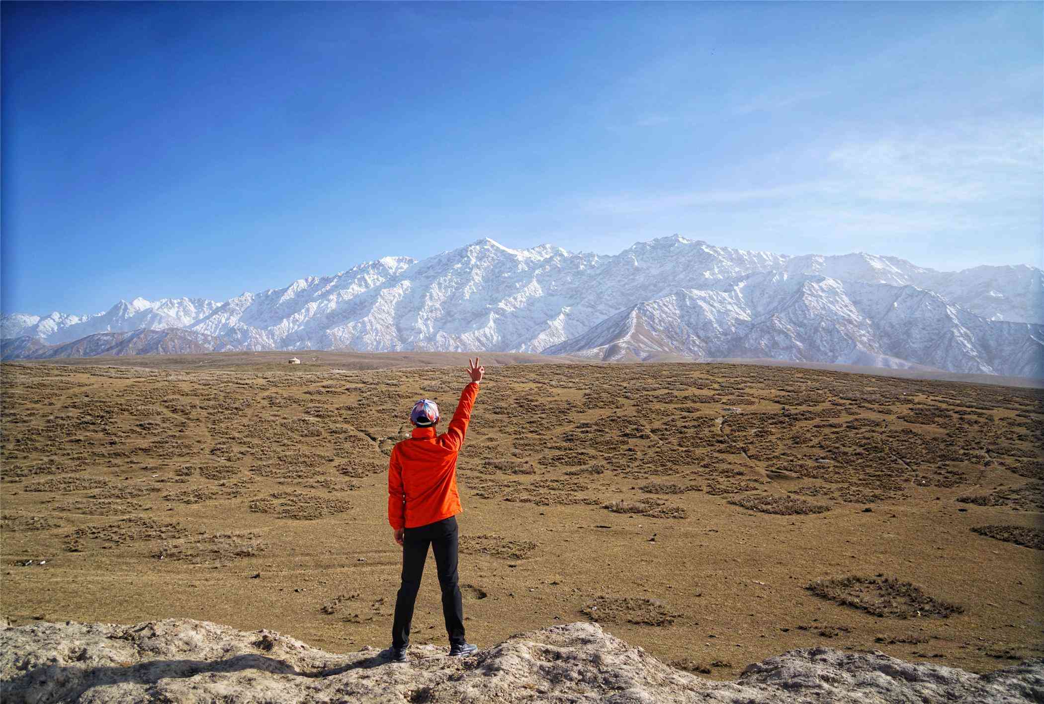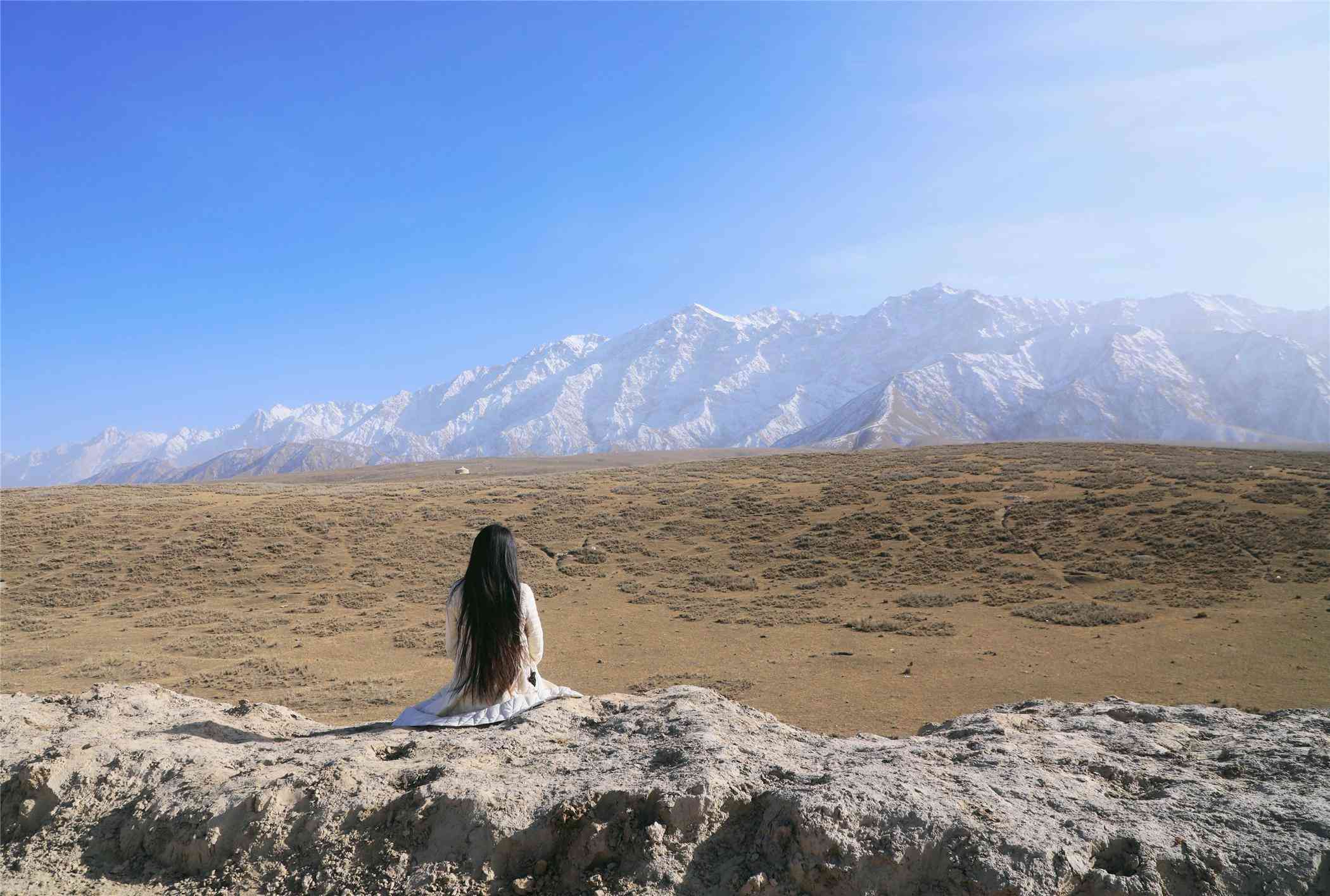 一边是连绵的沙丘、起伏的昆仑雪山,一边是草原戈壁、孤单的蒙古包,世界的主色调到了这里,忽然就变成了白色、黄色和蓝色,所有的一切以想象不到的冲击力,带我们完美的视觉享受,我和小伙伴们面向雪山,定格这一刻的画面。