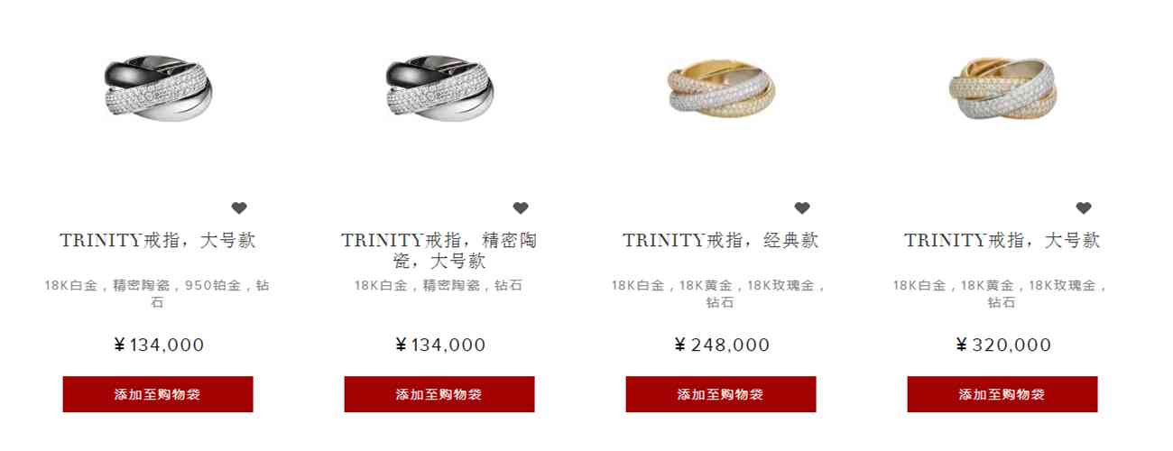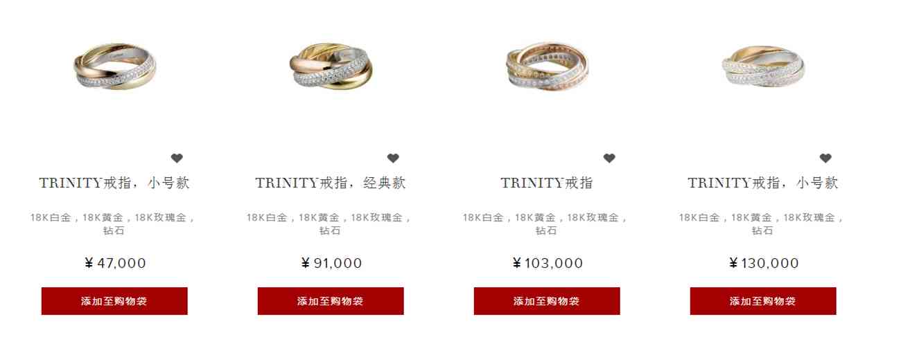 以上就是卡地亚三色戒指部分报价以及寓意,通过以上介绍大家可以发现,卡地亚戒指整体上并不算便宜,大多数戒指都在6000元以上,而镶钻戒指基本为上万元。因此建议大家在购买的时候以个人消费能力为主,选择预范围内的三色金戒指款式。