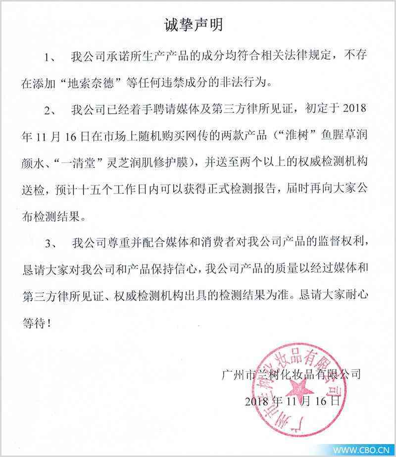 今日9:20,兰树方面再发声明,表示“我公司表示已着手聘请媒体和第三方律所见证,初定于2018年11月16日在市场上随机购买网传的两款产品(“淮树”鱼腥草润颜水、“一清堂”林芝润肌修护膜),并将送至两个以上的权威检验机构送检,预计十五个工作日内可以获得正式检测报告,届时再向大家公布检测结果。”