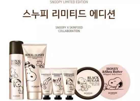 2015年,韩国美妆品牌Skin Food(思亲肤)与萌宠Snoopy(史努比)推出合作款,产品包括喷雾、面霜、护手霜、面膜和身体乳。
