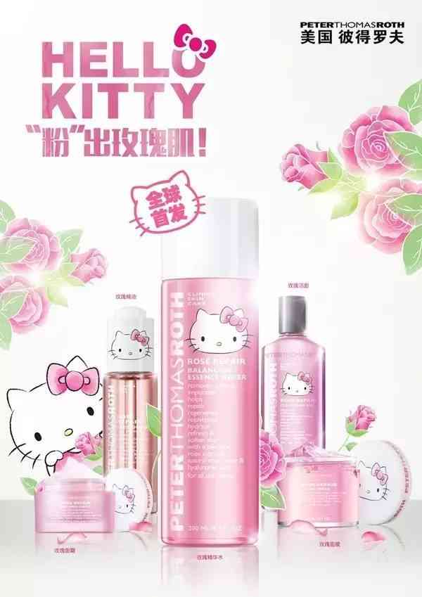 同年,美国护肤品牌peterthomasroth(彼得罗夫),也联合Hello Kitty推出了一款玫瑰平衡修护精华水,为衬托Hello Kitty的粉萌形象,创始人Peter Thomas Roth先生还穿上与Kitty同款的粉色衬衣。