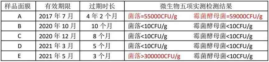 实验对象选择了亲们最爱屯的护肤品之一——面膜。由工作人员友情提供过期不同时间的面膜,五款面膜的过期时间依次为:2017年7月,2020年10月,2020年12月,2021年3月和2021年5月。