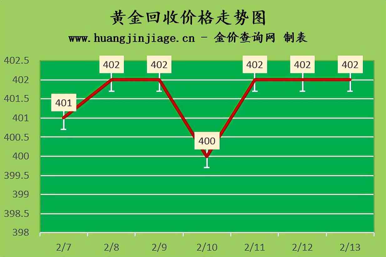 黄金回收价格402元/克,铂金回收价格186元/克,钯金回收价格300元/克,18K金回收价格292元/克,银条回收价格3.7元/克。(黄金行情是波动的,回收金价没有固定标准。)