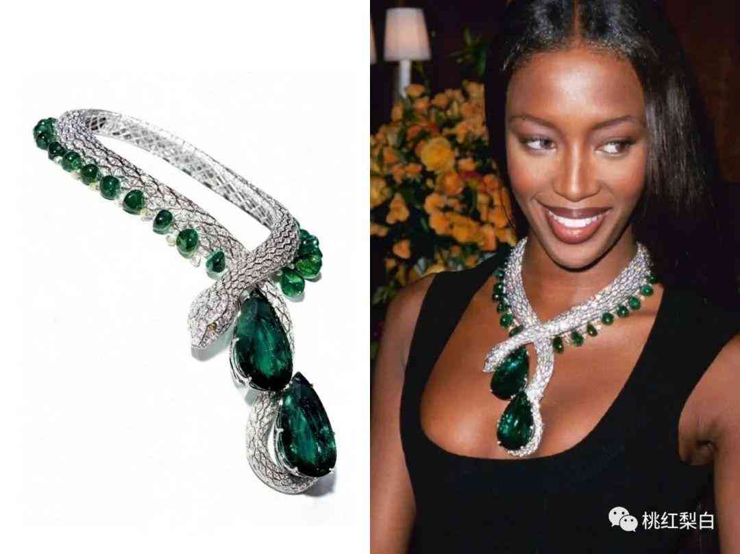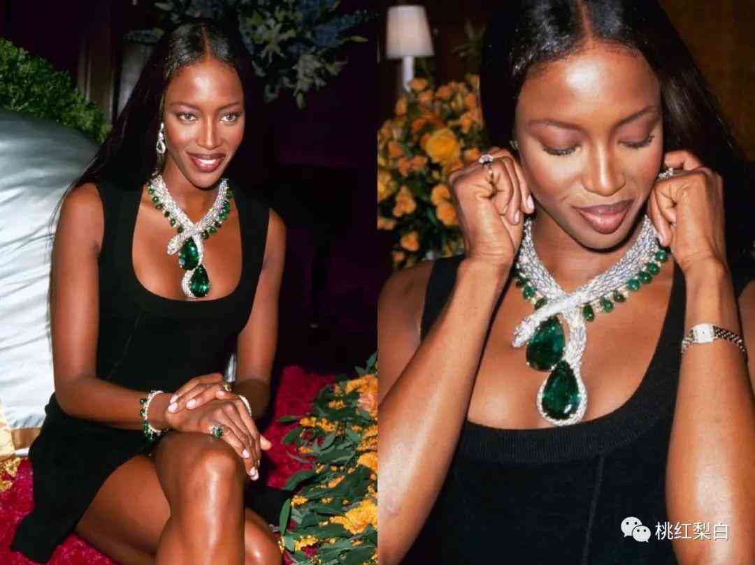 要说让我印象最深刻的祖母绿,还是要数老牌超模,“黑珍珠”Naomi Campbell在1998年卡地亚晚宴上戴的这条。