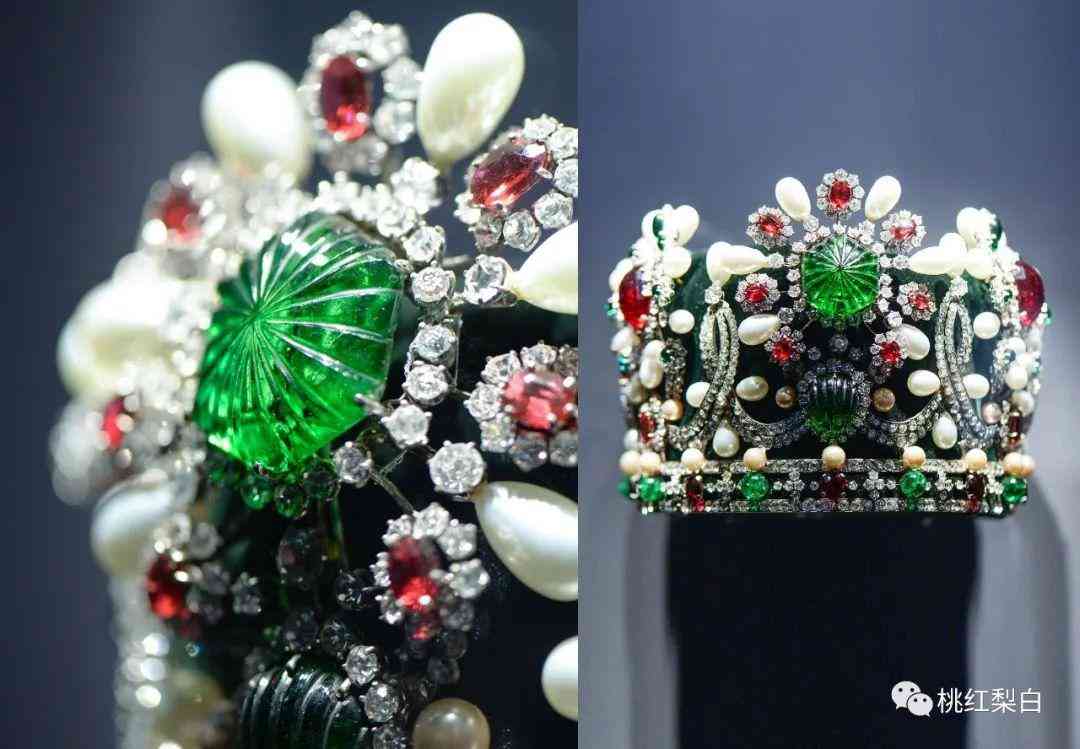 王冠的顶部镶嵌了19颗倒置的水滴形弧面祖母绿,最大的一颗重约15克拉。仔细看真的超美。