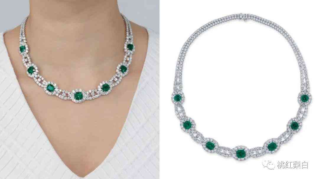 项链由14颗圆形祖母绿组成,戴起来有点像现在的chocker 。