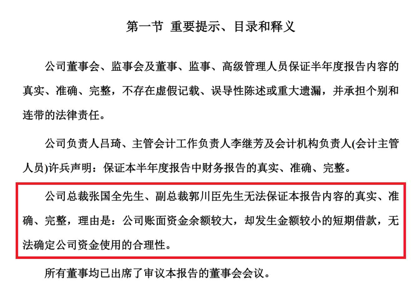 即使这份“扭盈为亏”的财报仍遭到了管理层质疑。在半年报中,公司总裁张国全和副总裁郭川臣提示道:“无法保证本报告的真实、准确、完整,理由是:公司账面资金余额较大,却发生金额较小的短期借款,无法确定公司资金使用的合理性。”