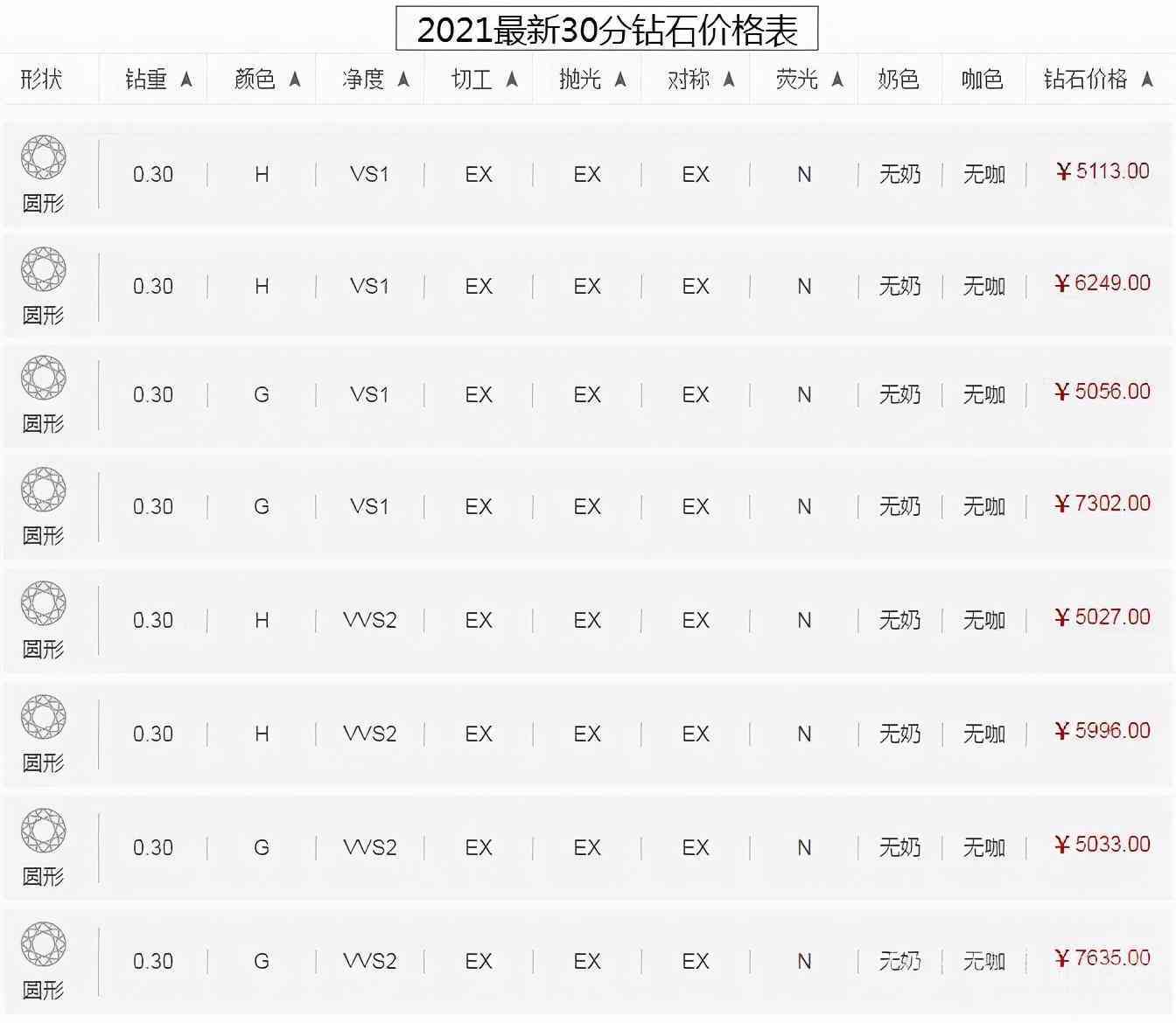 以下为我爱钻石网整理的2021年钻石价格表(以30分、50分、1克拉等常见钻石大小为例):