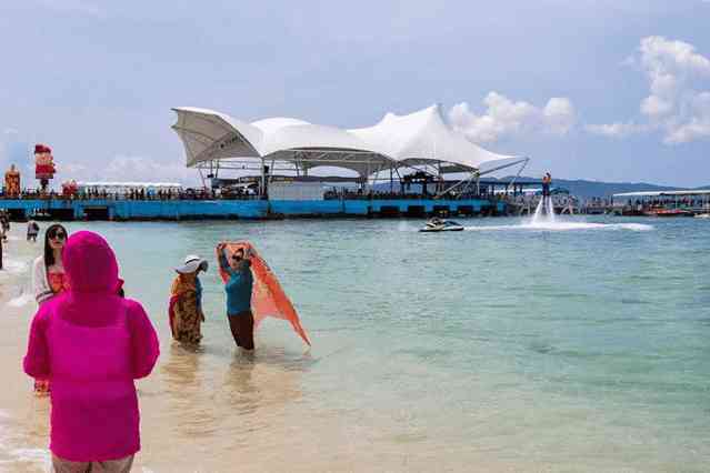 码头下来的右侧便是游玩区,水上漫步、摩托艇等常规项目便是在这里进行,岸边有沙滩躺椅和小圆屋提供给游客使用,拍照出来的效果特别好看。