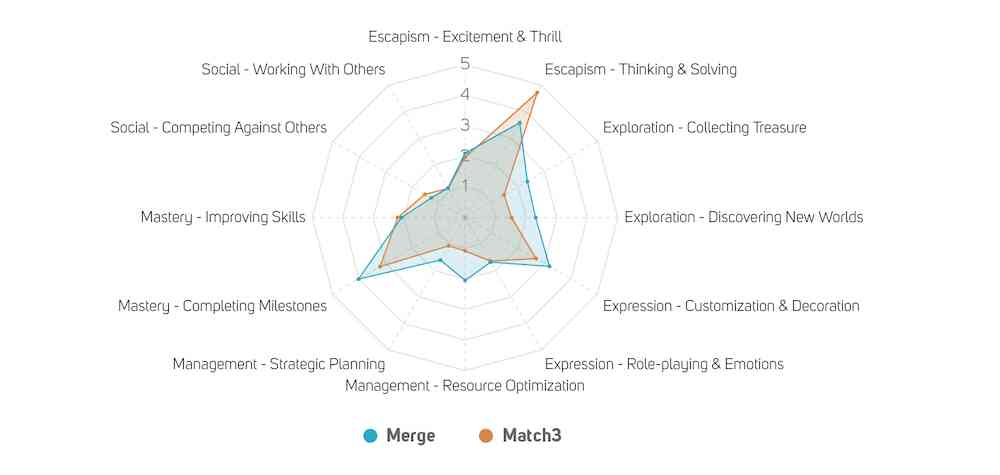 Game Refinery的一份报告也能与之佐证,他们指出,三消和合成游戏的游玩动机非常相似。以下面的分布图为例,蓝色、橙色部分,分别对应合成和三消玩家,我们可以看到,合成游戏的某些玩法也能够吸引三消玩家,例如完成里程碑式的任务、收集宝物和个性化定制/装扮等。