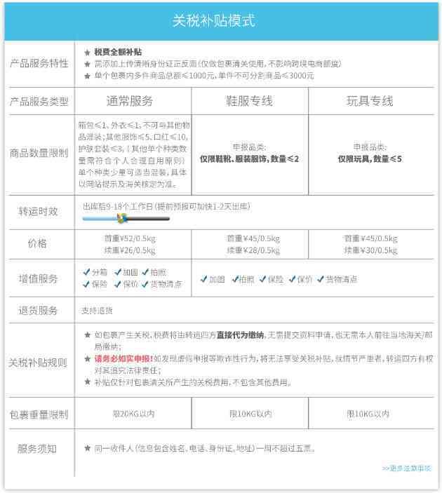 【优势】: 有关税补贴线路提供关税补贴,再也不用担心包裹被税问题;公开透明,包裹的入库、异常、清关等都有消息推送;可邮寄的商品比较广泛,如:电子产品、数码产品、保健品、化妆护肤品、普通生活用品等。