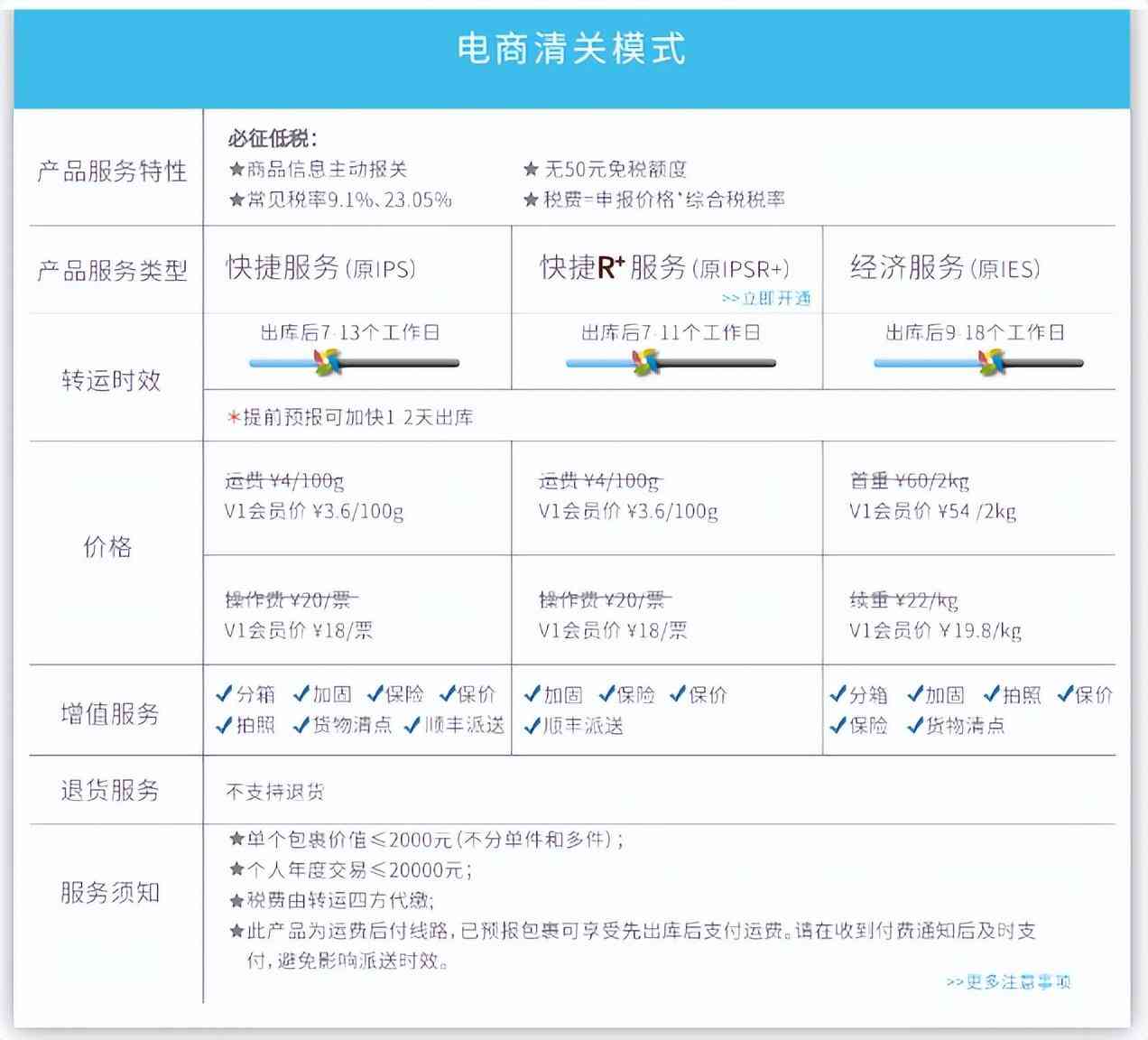 【增值服务】: 免费智能分箱、合箱、普通加固、提供内件照&称重照、2000元全程保险;特殊包装加固、退货服务需要收费。