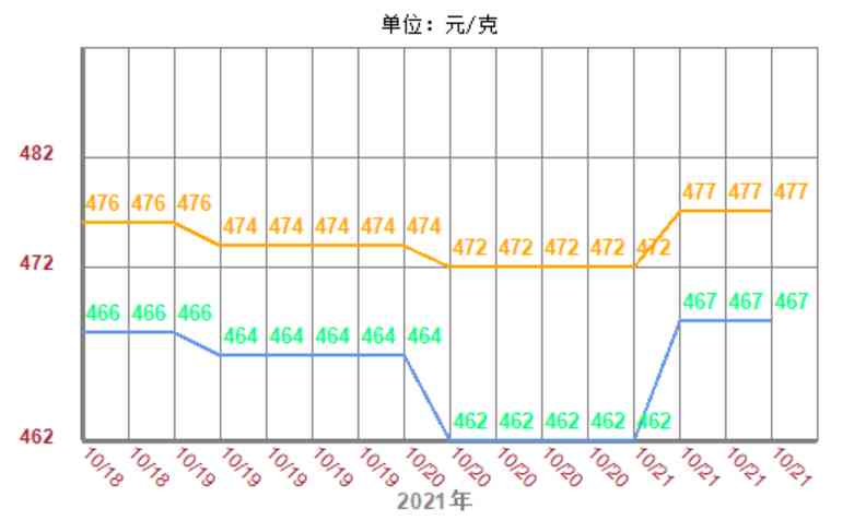 2021年10月21日国际黄金价格1783.66美元/盎司,国内黄金价格368元/克,香港金价19130港币/两,黄金回收价格363元/克,中国黄金基础金价368.1元/克,周大福黄金价格477元/克(涨5元),六福黄金价格477元/克(涨5元),周生生黄金价格476元/克(涨5元),老凤祥黄金价格478元/克(涨2元),老庙黄金价格475元/克(涨4元),菜百今日金价472元/克(平),周大生金价477元/克(涨5元),以上黄金报价仅供参考。