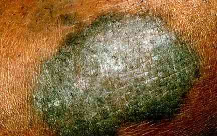 那块硬壳,就像冻疮很久之后留下的厚壳,不过手感更皮实粗粝,棕红色也已变为暗褐色。最开始的丘疹变厚之后,已经融成了一片,看上去就像“苔藓”。