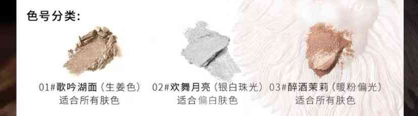 色号分类:01歌吟湖面(生姜色) 02欢舞月亮(银白朱光色) 03醉酒茉莉(暖粉偏光色)