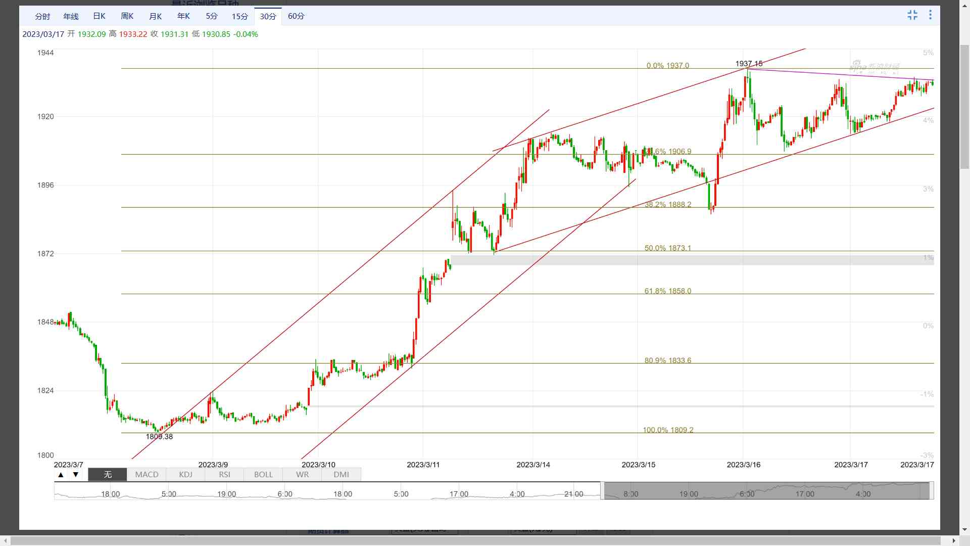 下面30分钟K线图中的金价1809美元以来的上涨,可以认为是上述向上“调整浪”的第3浪上涨。这个第3浪上涨,走出了期货市场常见的先急涨、再缓涨的形态,图中分别显示了其价格运行通道。