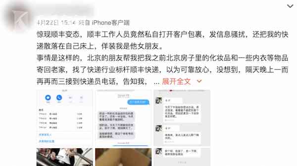 4月22日晚间,一条有关“顺丰快递员私自打开包裹”的话题在社交网络上热议。当日下午,一位用户在网上晒出了和朋友的寄件经历,称顺丰工作人员打包快递时向用户索取包装费,并未经允许打开客户包裹,发信息骚扰,并在朋友圈晒出客户的物品用来“糊弄朋友”。