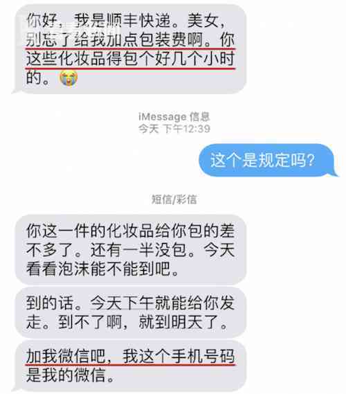 该网友称,此前朋友通过顺丰快递邮寄化妆品和一些内衣等物品,却在隔天晚上一而再再而三接到快递员电话,快递员以“化妆品一定会碎”为由头表示缺乏相应的泡沫包装化妆品,需要拖一两天再发货,后又以“开玩笑”的方式向客户索要包装费。