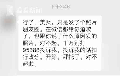 由于怕遭到投诉被开除,该快递员将前述朋友圈状态删除,并不断向客户强调不要打电话投诉。