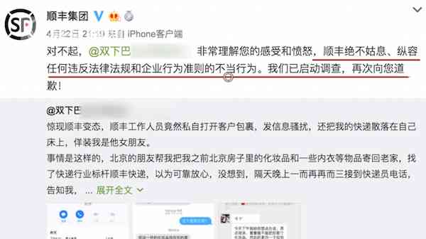 对此,顺丰官方当晚21时许通过微博表示道歉,称“顺丰绝不姑息、纵容任何违反法律法规和企业行为准则的不当行为。我们已启动调查。”