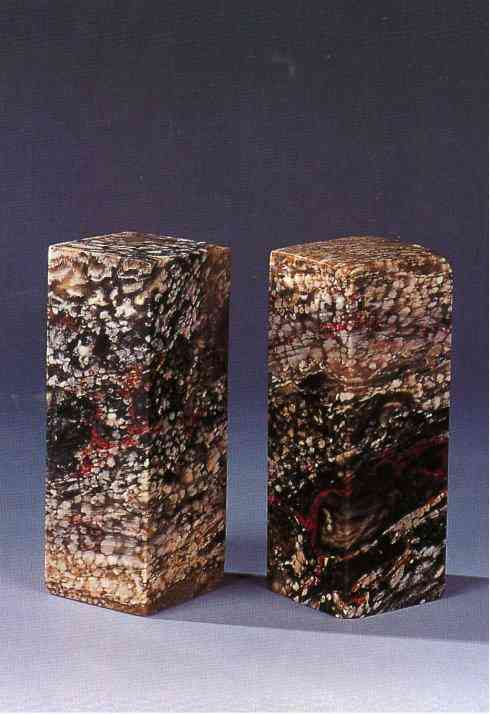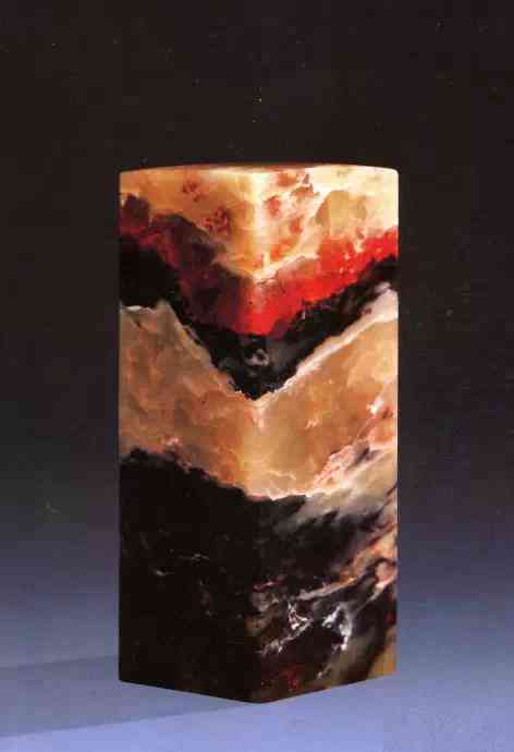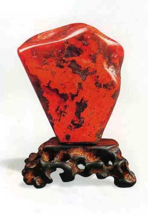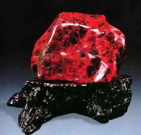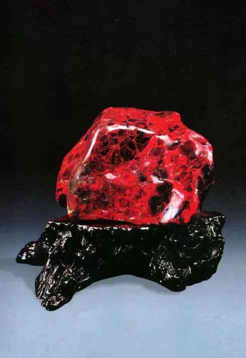 【地质特征】巴林石脉形成后,有大量辰砂灌入之入成为红色,有大量锰、钛质处成为青黑色,并保留有火山喷发后形成岩的流动构造。