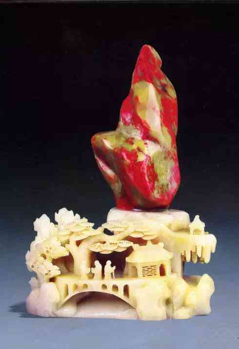 [地质特征] 该石是沿较纯净的高岭石脉的节理、裂隙充填了较纯净的辰砂矿物,靠近地表条件下形成,多呈细脉状。石质多属绵料。