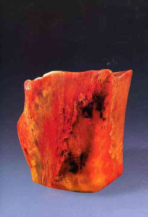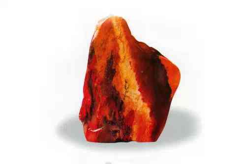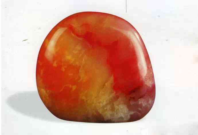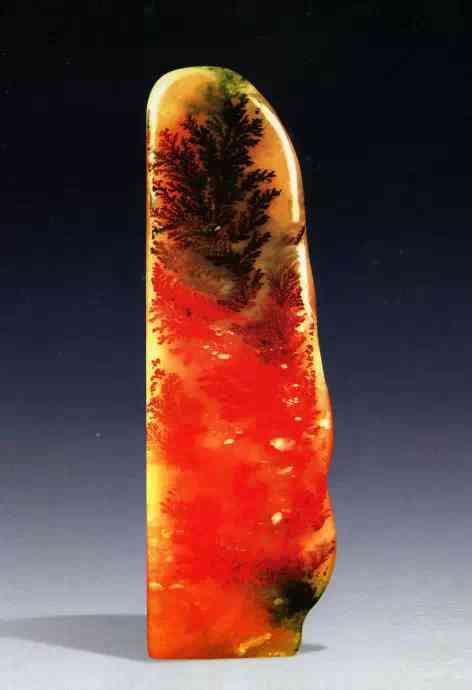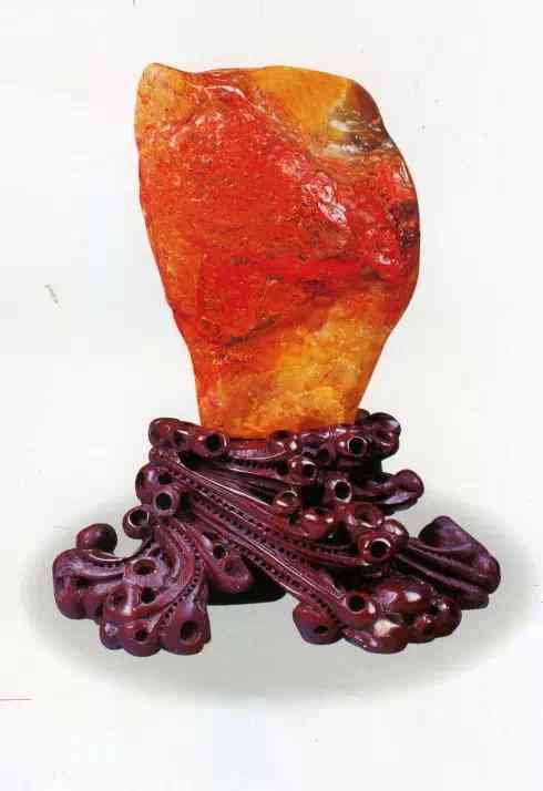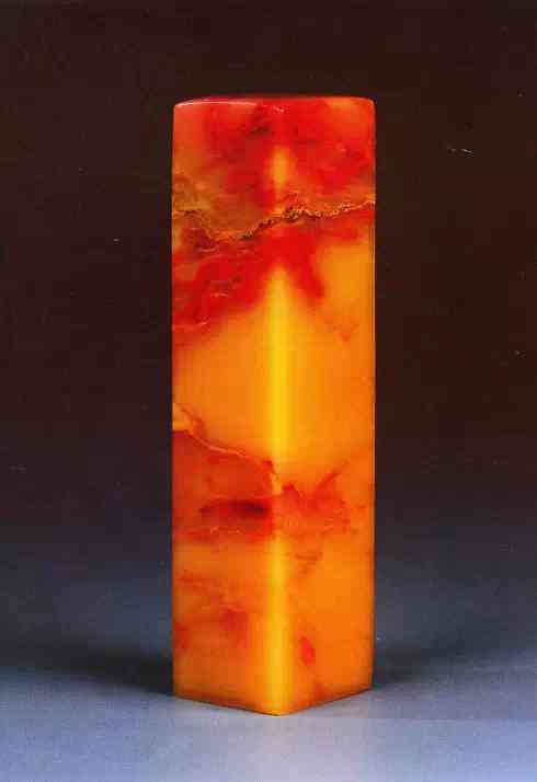 【外貌特征】通体呈橘黄色,纯正无杂,鲜红的鸡血渗透其中,好像金秋十月熟透的金橘。