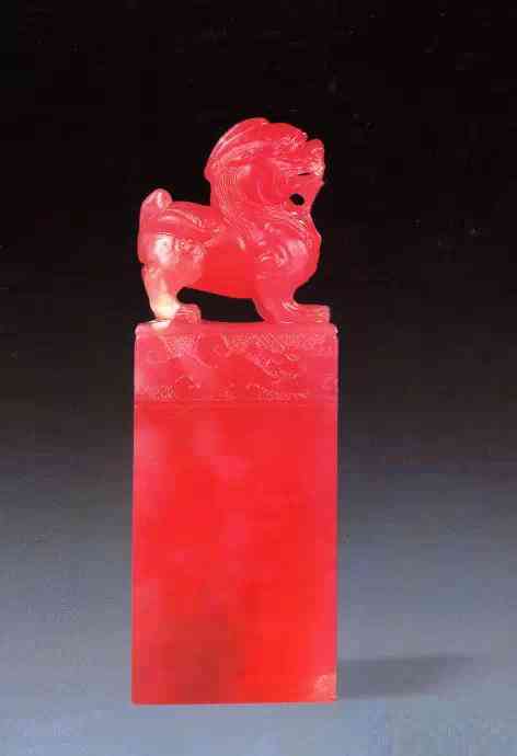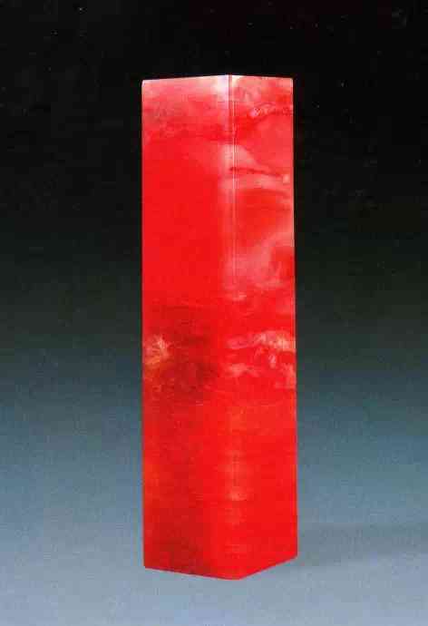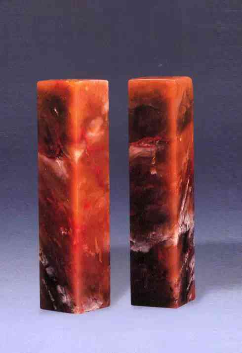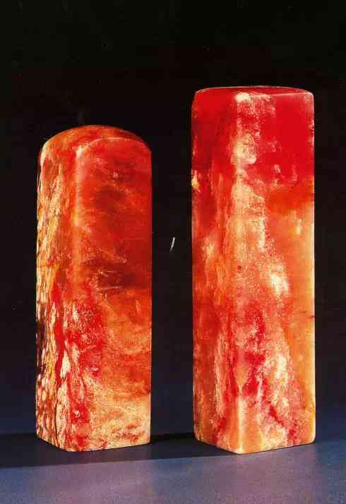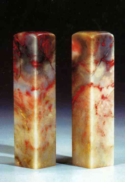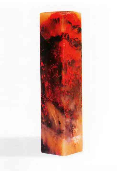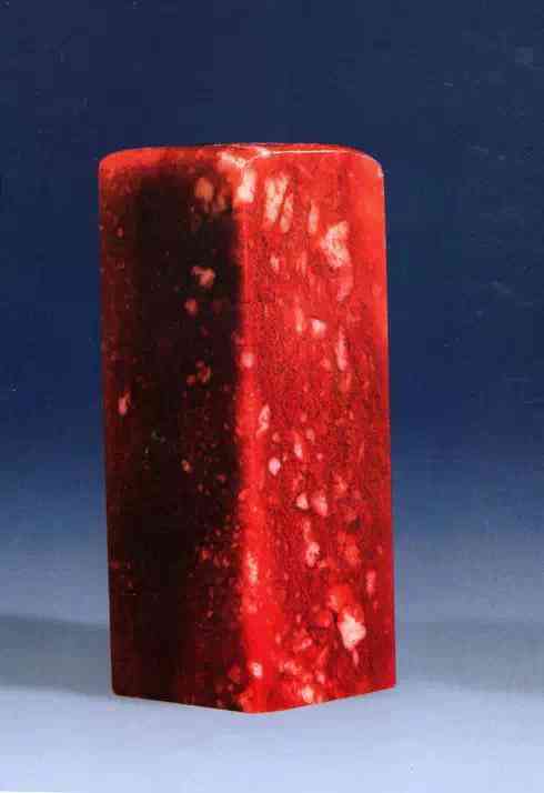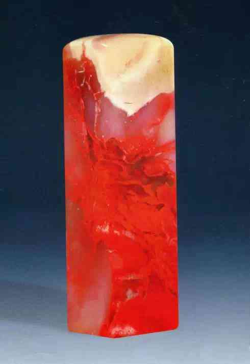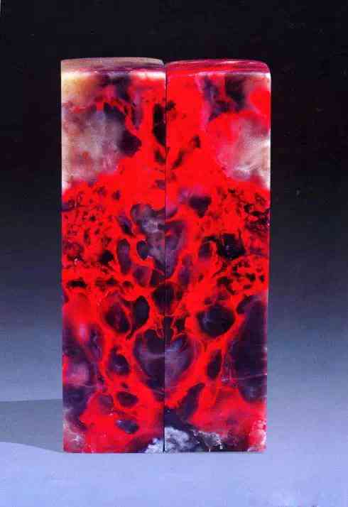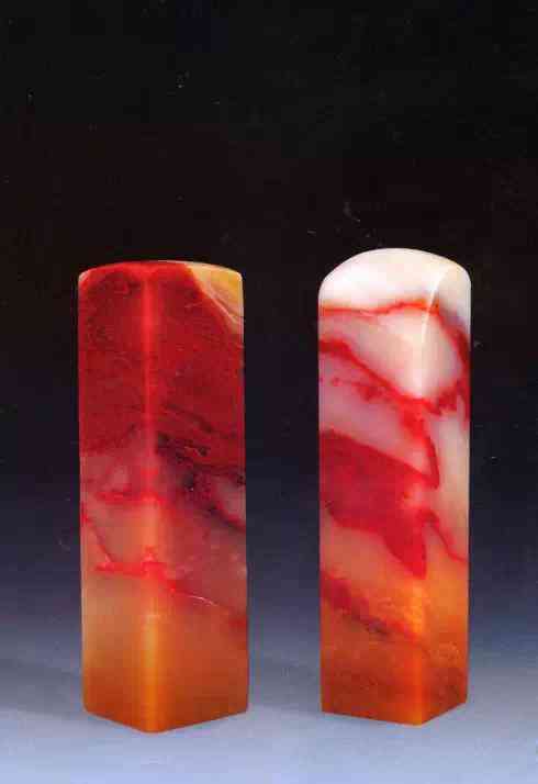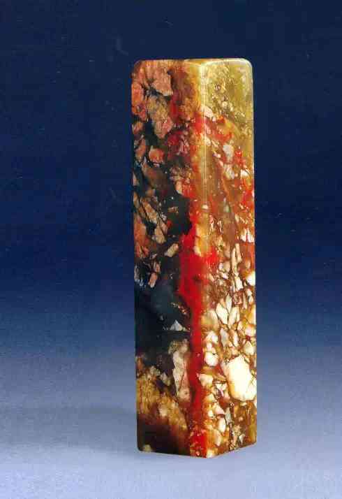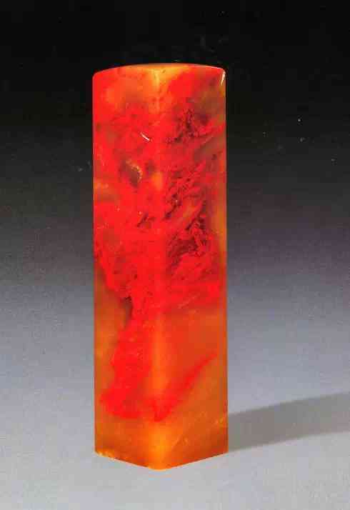 [外貌特征] 泛黄的鱼籽布满石上,鲜红的鸡血渗透其中。构成“鱼腹生就龙门志,石中开出玺印材”的意境。