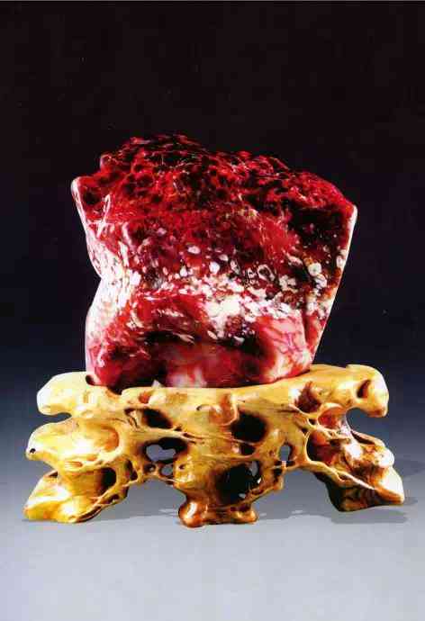 这类石头的色彩若华艳富丽的牡丹花,在粉红色半透明的地子上飘逸着片片鸡血,雍容华贵,有锦绣烂漫之神韵,是幸福美好的象征。