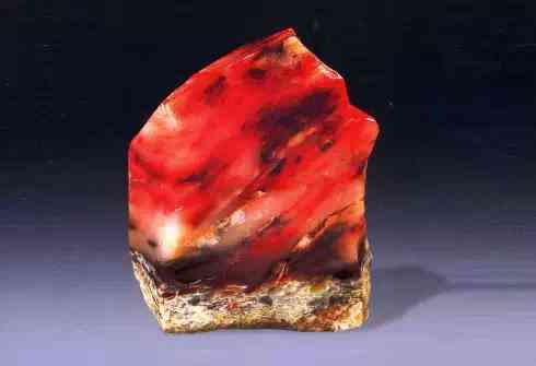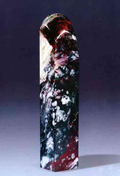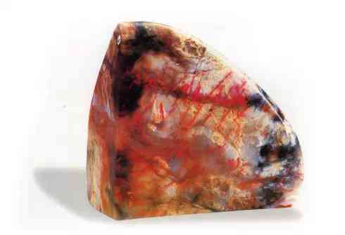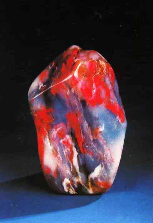 【地质特征】该石紫红的主色为辰砂与赤铁矿相互渗透而形成。