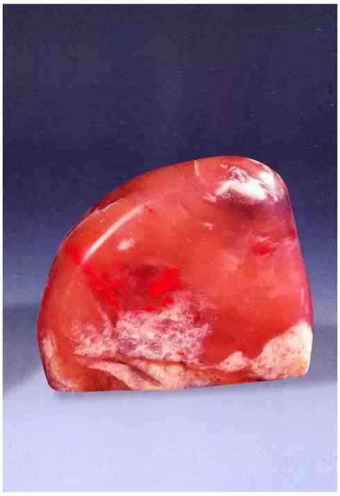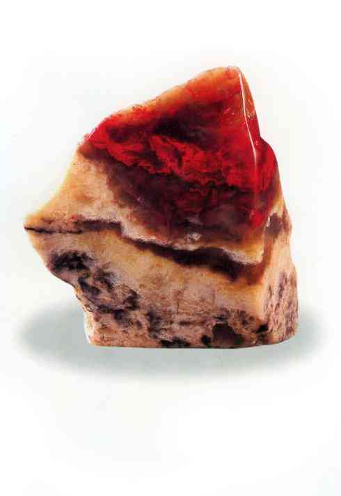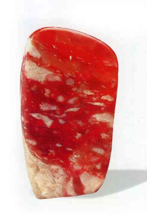 [外貌特征] 白色质地的石料如玉,渗透红色的鸡血好似玉女化妆,因而取名白玉红。