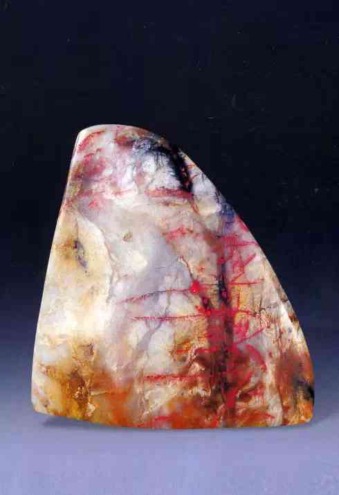 [外貌特征] 红蓝黑白的线条层次分明地布于石上,犹如“翩翩嫦娥舒广袖,绵绵彩练舞长空。”