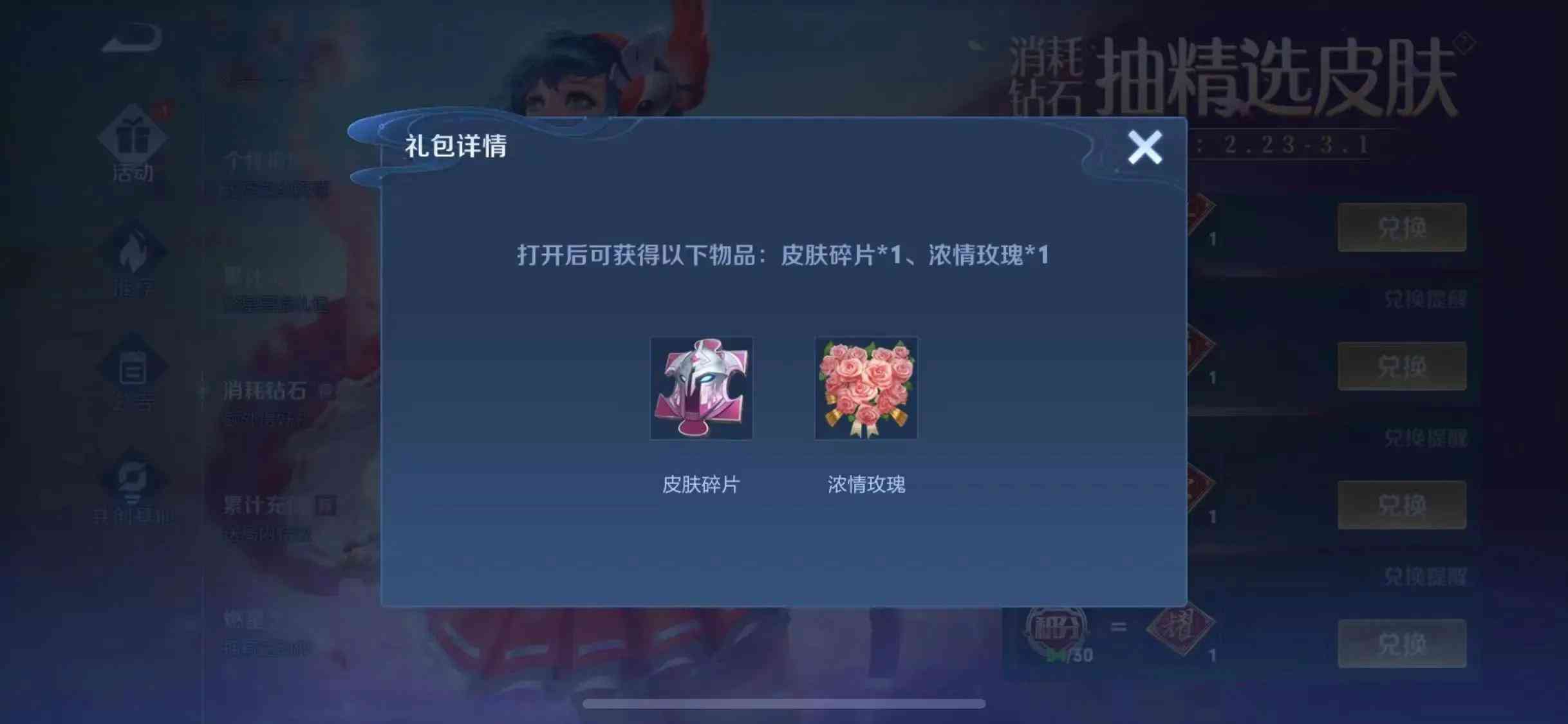 兄弟们直接兑换中间那两个“者”和“荣”的奖励即可,里面分别有一个皮肤碎片。所需积分20点,去抽一波钻石五连抽即可,四舍五入跟一键领取没啥区别。