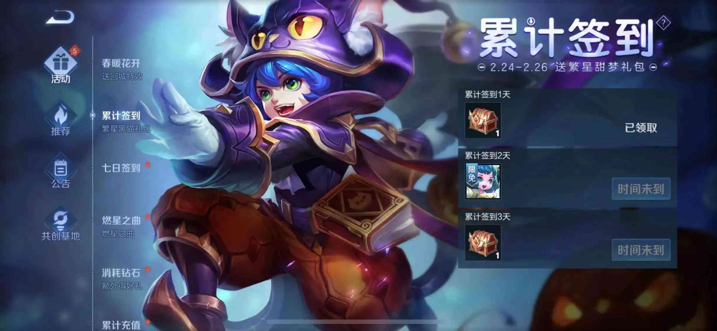 从今天开始,连续登录三天可以拿到两个“繁星甜梦礼包”,这玩意就是抽蔡文姬源梦和黑猫爱糖果那个盒子,有打算抽皮肤的玩家可以领完这两个盒子再抽。