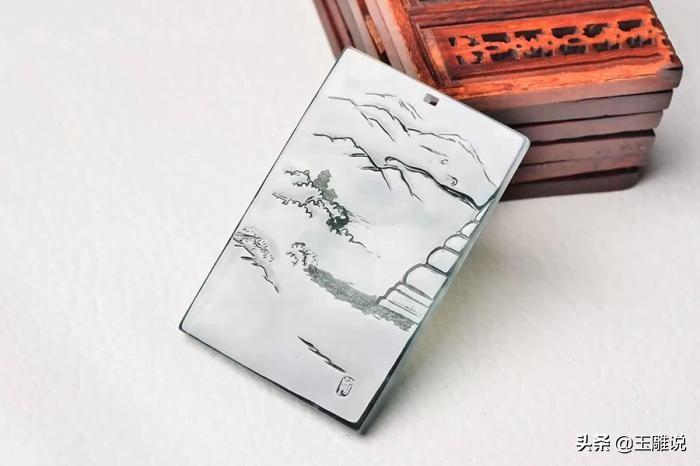经过玉雕师的精心努力雕琢,山水挂件的毛货总算是完成了。原石上飘着的那些一团团黑黑的色彩,已变成一层层幽绿群山,当初那块不入人们眼球的毛料,此刻已是人人哄抢的翡翠山水方牌。