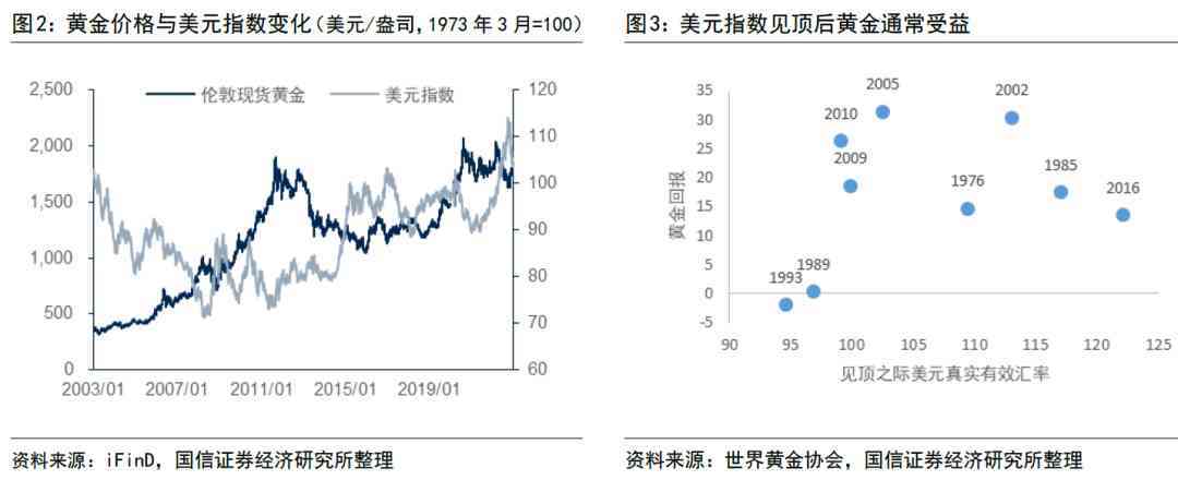 一是美元指数(负相关)。由于黄金存在一定的货币属性,会和与其他货币体现出一定的地位博弈关系,所以黄金价格通常与美元指数负相关,如美元指数上升,美元升值,资金流向美元,黄金价格短期下跌。