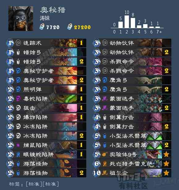 显而易见的,这是一套围绕奥秘打造的猎人套牌。9张奥秘可以保证很大概率让“小型法术翡翠”和“祖尔金(10费dk卡5甲,战吼:重新施放一遍本局对战中施放过的法术,目标随机)”生出4狼(当然祖尔金随机施放的“侧翼打击”和“杀戮命令”可能会把自己的狼打死),所以我们建议,场面允许的情况下,“杀戮命令”尽量留到最后斩杀时使用吧。