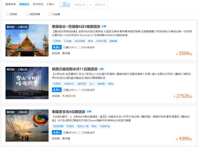 记者查询携程旅行平台,按照出境跟团游销量排名,个就是“泰国曼谷+芭堤雅6日5晚跟团游”。