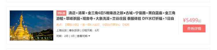 “普吉岛5日4晚”纯玩之旅,价格为3999元/人;“曼谷+芭提雅6日5晚臻品游”每人价格在3699元起;“清迈+清莱+金三角6日5晚臻选之旅”价格相对高一些,每人5499元/起。