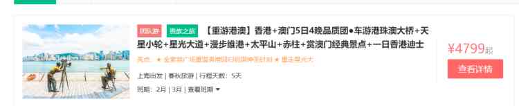 记者查询春秋旅游平台,“香港+澳门5日4晚品质团”价格4799起/人,行程包含了天星小轮、星光大道、维多利亚港、太平山、赤柱、以及澳门经典景点等。