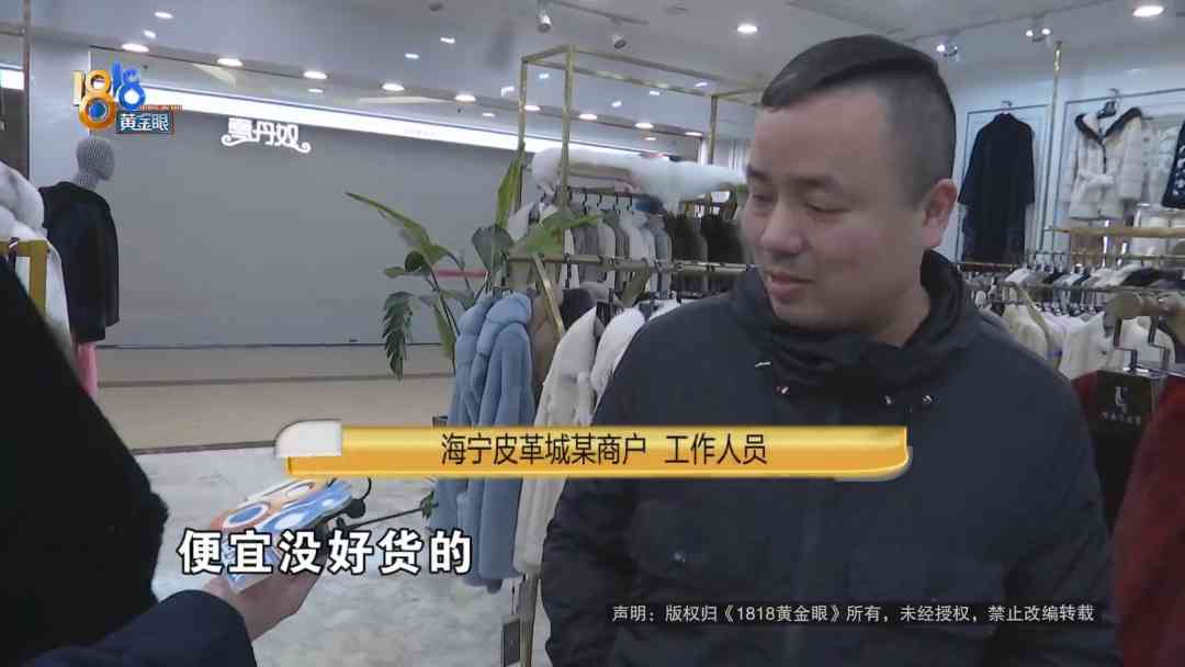 海宁皮革城某商户(A) 工作人员02:这我不清楚,我们店里没有,它里面是底绒,外面是针呀,看得出来的,你撩开来。然后再里面它就是皮板。就是百分之一百真皮真毛,没有含多少的,亏本卖有的,但是正常的话,是买不到的。