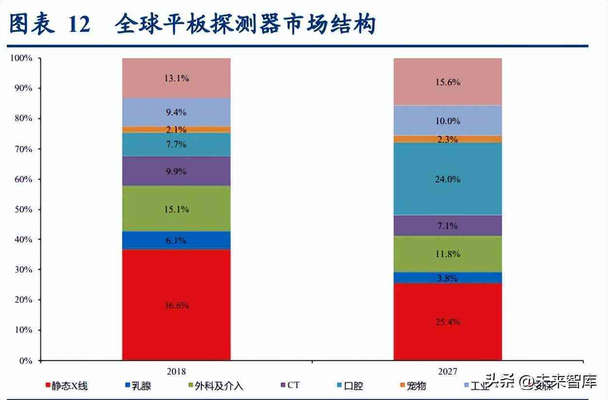 而数字化口内摄影系统属于静态设备,用于口腔局部 X 线摄影(如 1-4 颗牙齿的拍摄), 此前因产品价格较高,口腔医疗机构主要使用以 CR 影像板为核心部件的半数字化摄影 设备。随着 CMOS 在平板探测器领域应用逐渐成熟,口内摄影系统数字化升级成本有所 降低,数字化口内摄影系统对半数字化口内摄影设备替代趋势显现,并逐渐成为必备设备之一,叠加全球口腔医疗机构较快的设立增速,产品市场需求攀升,潜力巨大。据奕 瑞公告,2021 年全球需求量约 16 万台。假设全球均价 900 美元,21 年全球市场规模 1.4 亿美元,假设全球需求量 CAGR 为 15%、产品均价年降幅 4%,预计 2027 年全球需求量 37 万台,产品均价 700 美元,市场规模 2.6 亿美元,2021-2027 年复合增速约 10.4%。