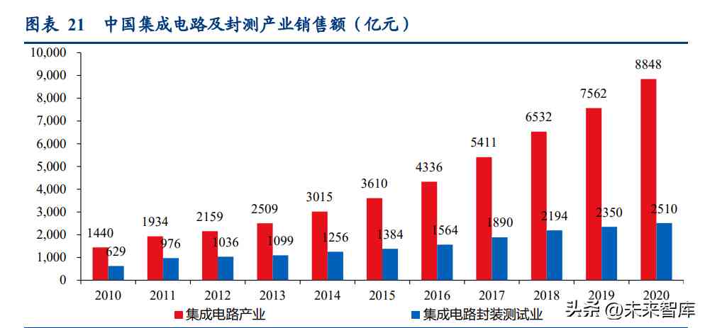集成电路处于电子信息产业链顶端,随着电子产品应用和普及而快速发展。全球集成电 路产业销售额从 2010 年 2,499 亿美元增至 2021 年 4,597 亿美元,CAGR 为 5.7%。我国 集成电路产业近年平稳快速增长,销售额从 2010 年 1,440 亿元增至 2020 年 8,848 亿元, CAGR 为 19.9%。集成电路中半导体生产流程包括晶圆制造、晶圆测试、芯片封装、封装 后测试等,封装测试是重要板块之一,约占整体 1/3。X 线无损检测可用于晶圆检测(检 测晶圆切割角度、尺寸等)与封装后检测(检测芯片内部线路排布、焊接、封装情况等), 集成电路产业的快速发展驱动集成电路 X 线检测设备和对应平板探测器的需求增长。