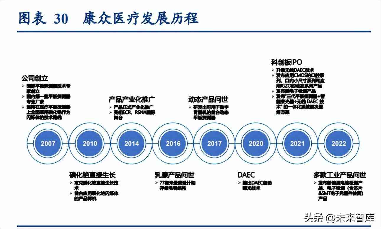2010 年前我国尚未出现专门的平板探测器生产商,相关技术和市场基本被国外巨头垄断。 2010 年以后,逐渐有国产厂家进入该行业,其中奕瑞和康众平板探测器技术目前已经达 到国际同行水平。奕瑞 2011 年成功研制出中国大陆款国产非晶硅 TFT 传感器和基 于该传感器的数字化 X 线探测器并实现产业化,打破国外厂商技术垄断,2012 年启动碘 化铯项目并实现当年投产,2015 年发布首款动态产品,2018 年发布首款 IGZO 平板探测 器,2019 年成功具备柔性 X 线探测器制造生产能力,成功跻身全球少数几家同时掌握非 晶硅、IGZO、CMOS 和柔性基板四大传感器技术并具备量产能力的 X 线探测器公司之 一。康众自成立起便追求低剂量技术路线,2010 年攻克碘化铯直接生长技术,生产了首 台应用碘化铯闪烁体的产品样机,并坚持全系列医疗领域产品均使用碘化铯,2014 年产 品正式产业化推广,2015 年推出首款工业/安检产品,是国内首批推出国产工业/安检用 平板探测器的厂家之一,2016、2017 年乳腺产品、动态产品相继问世,2021 年发布应用 CMOS 传感器的口腔系列产品和应用 IGZO 传感器的动态系列产品。