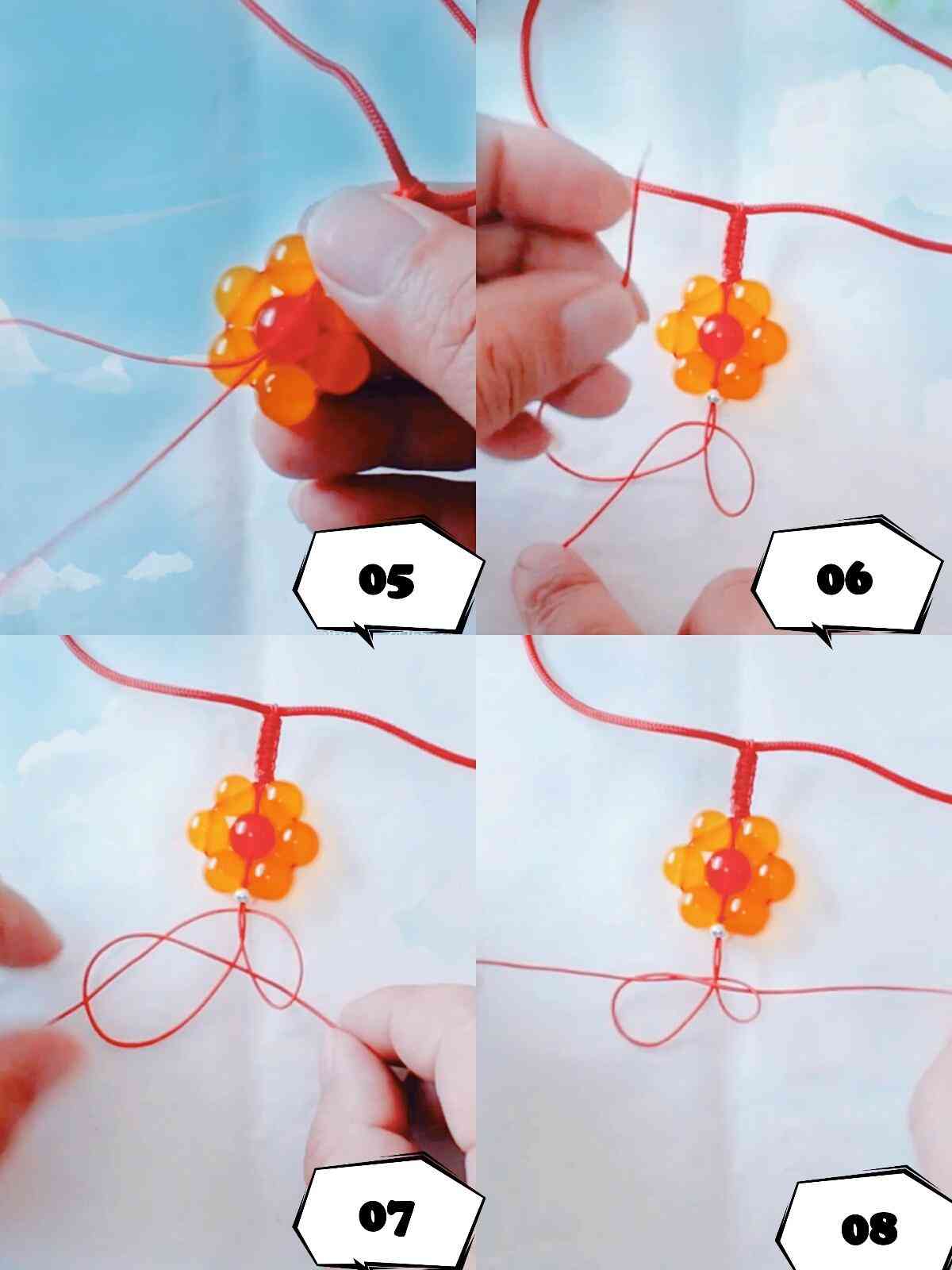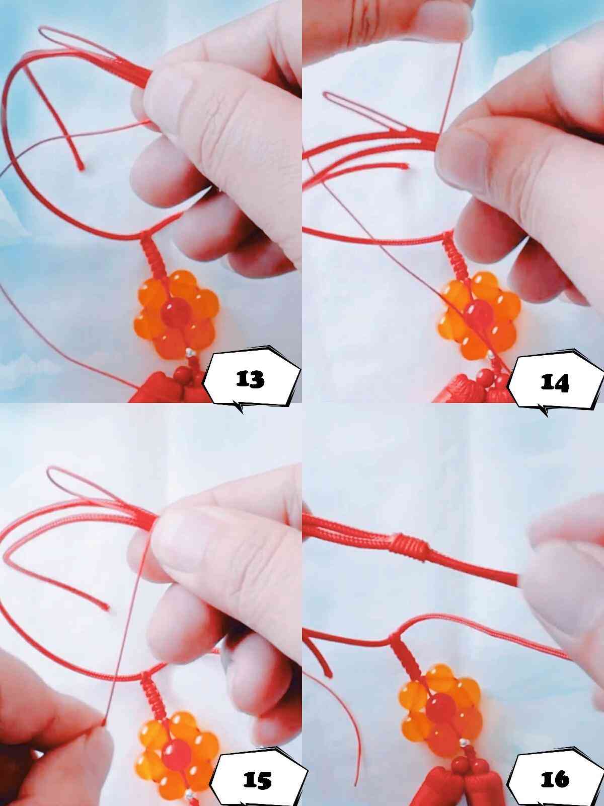 平结寓意着四平八稳,平平安安之意。编织完平结再另外穿一根线。减掉编织平结的线头。在新增加的两根红线上穿上一颗大的红色的珠子,这个珠子是放在六个珠子围成的圆圈中间位置,两根线打结系好固定珠子。在两根线上穿一颗小珠子,然后用蛇结的编法编织三次。