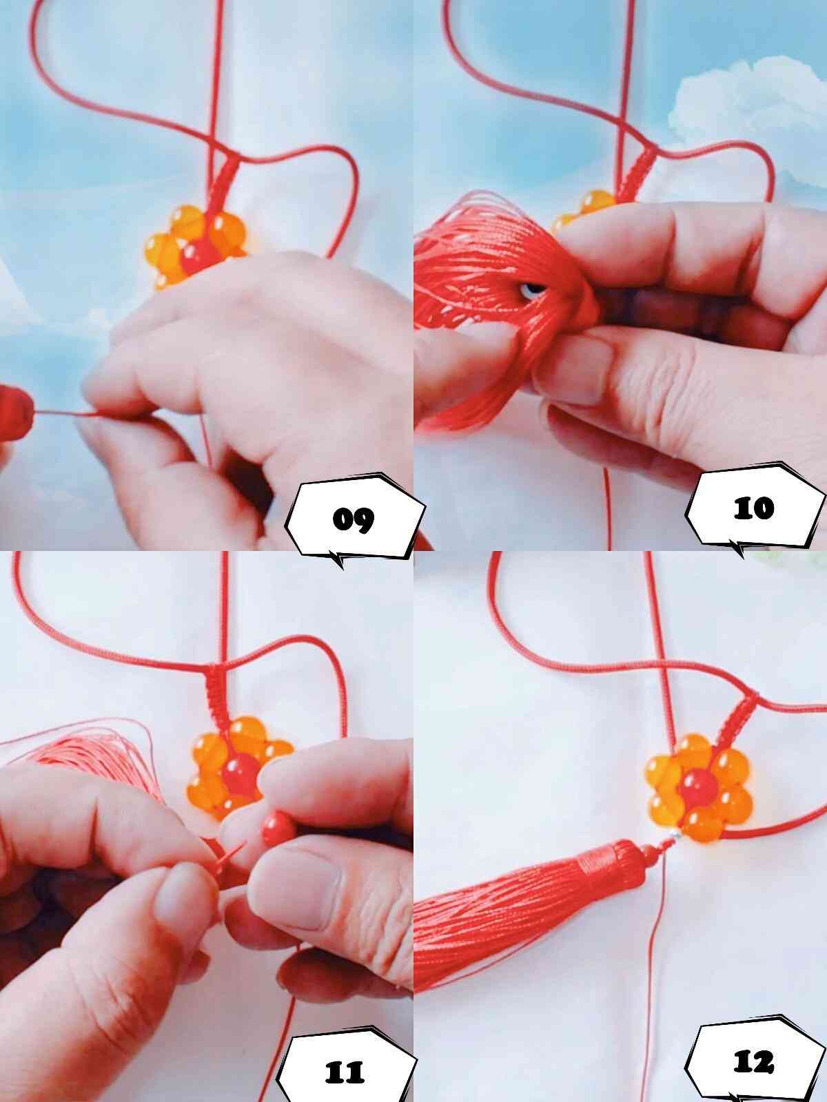 我们在绳子的末端再加上两颗珠子,这样一串漂亮的桃花芯汽车挂件就编织好了。