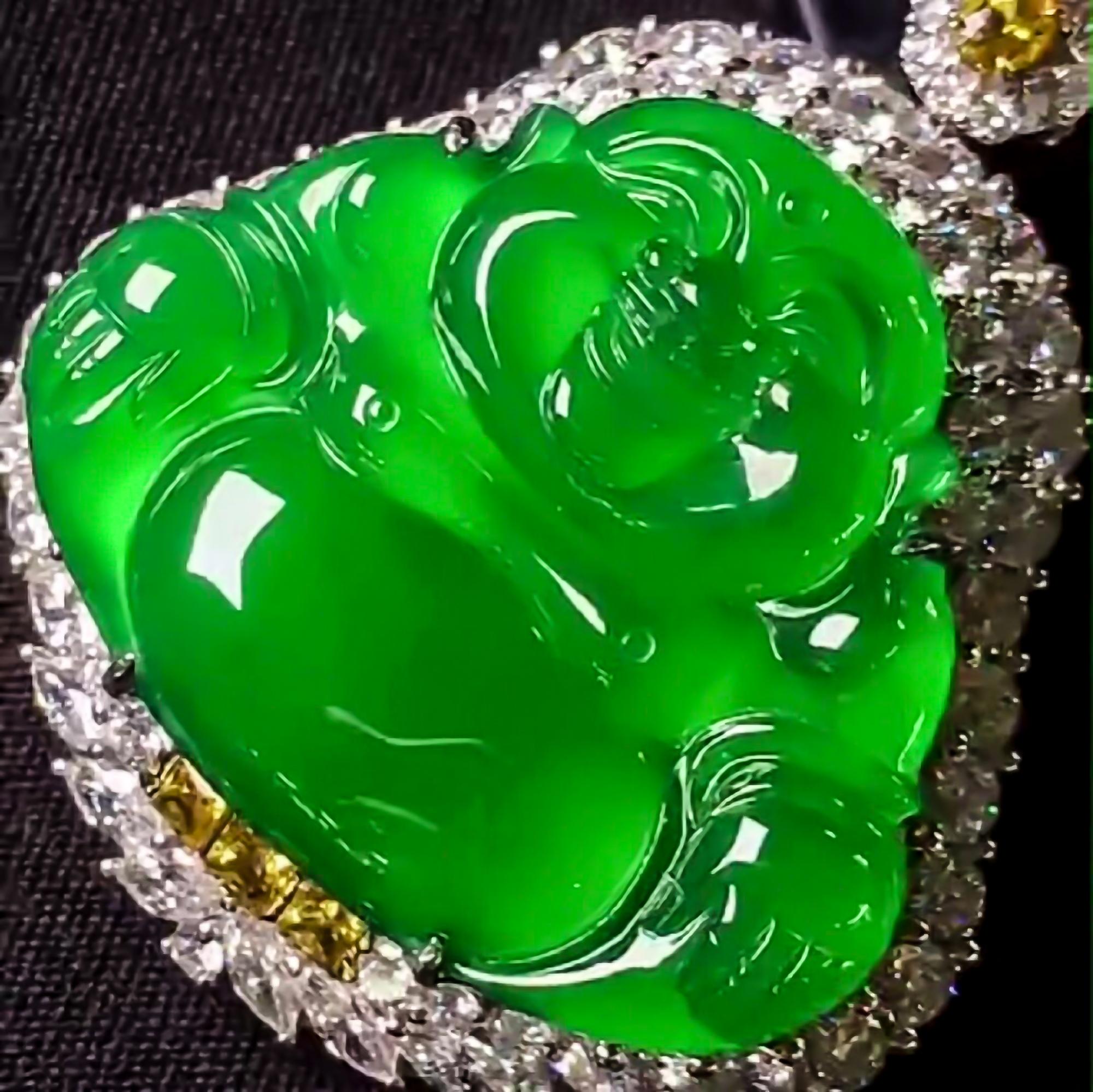 它们的底子也更有不同,阳绿为化底,绿多而黄少,透明度一般但是给人一种亮堂堂的质感;而帝王绿则不会有絮状或者团状的结晶情况,整体底子上而言也显得晶莹剔透。